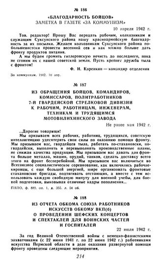 Из обращения бойцов, командиров, комиссаров, политработников 7-й гвардейской стрелковой дивизии к рабочим, работницам, инженерам, техникам и трудящимся Мотовилихинского завода. Не ранее мая 1942 г. // ПАПО, ф. 889. оп. 1, д. 355. л. 54 об.