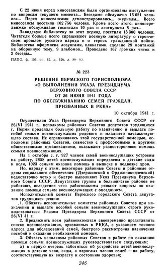 Решение пермского горисполкома «О выполнении указа Президиума Верховного Совета СССР от 26 июня 1941 года по обслуживанию семей граждан, призванных в РККА». 10 октября 1941 г. // ГАПО, ф. р-176, оп. 5. д. 77, л. 19-20.