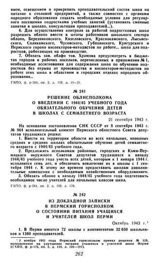 Решение облисполкома о введении с 1944/45 учебного года обязательного обучения детей в школах с семилетнего возраста. 21 сентября 1943 г. // ГАПО, ф. р-564, оп. 2. д. 192. л. 176.