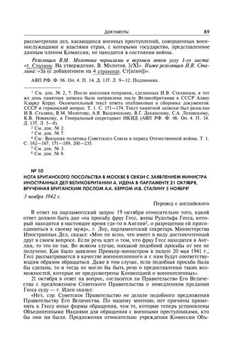 Нота британского посольства в Москве в связи с заявлением министра иностранных дел Великобритании А. Идена в Парламенте 21 октября, врученная британским послом А.К. Керром И.В. Сталину 5 ноября. 3 ноября 1942 г. // АВП РФ. Ф. 06. Оп. 4. П. 14. Д. 137. Л. 24-25. Подлинник перевода.