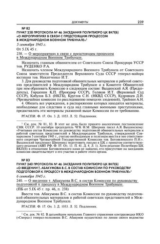 Пункт 240 протокола № 46 заседания Политбюро ЦК ВКП(б) «О введении т. Абакумова В.С. в состав комиссии по руководству подготовкой к процессу в Международном военном трибунале». 6 сентября 1945 г.