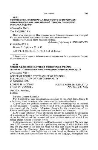 Сопроводительное письмо А.Я. Вышинского ко второй части обвинительного акта, направленной главному обвинителю от СССР Р.А. Руденко. 24 сентября 1945 г. // АВП РФ. Ф. 082. Оп. 32. П. 178. Д. 1. Л. 61. Копия.