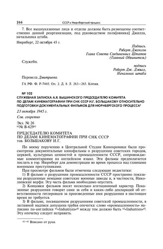 Служебная записка А.Я. Вышинского Председателю комитета по делам кинематографии при СНК СССР И.Г. Большакову относительно подготовки документальных фильмов для Нюрнбергского процесса. 23 октября 1945 г. // АВП РФ. Ф. 07. Оп. 13. П. 41. Д. 9. Л. 26-27. Копия.