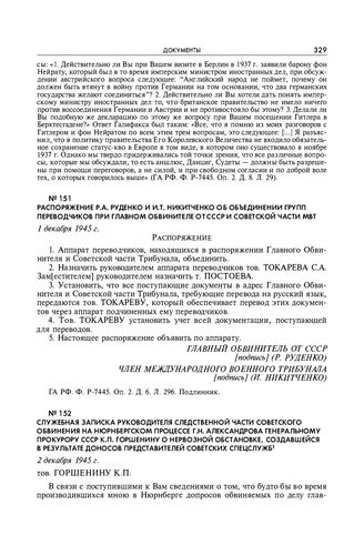 Распоряжение Р.А. Руденко и И.Т. Никитченко об объединении групп переводчиков при главном обвинителе от СССР и советской части МВТ. 1 декабря 1945 г. // ГА РФ. Ф. P-7445. Оп. 2. Д. 6. Л. 296. Подлинник.