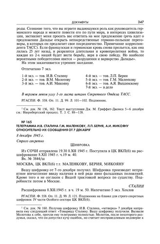 Телеграмма И.В. Сталина Г.М. Маленкову, Л.П. Берия, А.И. Микояну относительно их сообщения от 7 декабря. 8 декабря 1945 г.