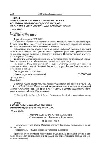 Приветственная телеграмма по прямому проводу коллектива работников советской части МВТ И.В. Сталину в связи с первой годовщиной Дня Победы. 9 мая 1946 г.