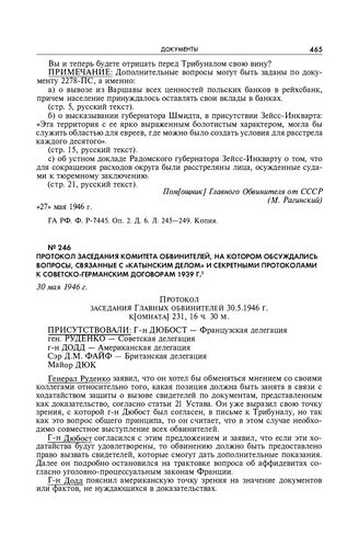 Протокол заседания Комитета обвинителей, на котором обсуждались вопросы, связанные с «Катынским делом» и секретными протоколами к советско-германским договорам 1939 г. 30 мая 1946 г.