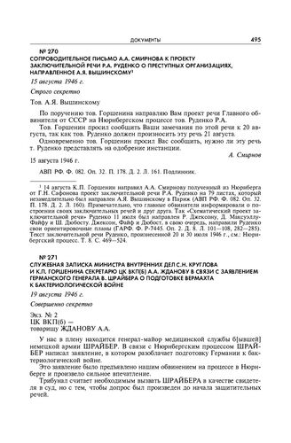 Служебная записка министра внутренних дел С.Н. Круглова и К.П. Горшенина секретарю ЦК ВКП(б) А.А. Жданову в связи с заявлением германского генерала В. Шрайбера о подготовке вермахта к бактериологической войне. 19 августа 1946 г. // РГАСПИ. Ф. 17. Оп. 121. Д. 549. Л. 83. Подлинник.