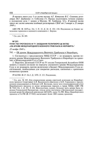 Пункт 745 протокола № 71 заседания Политбюро ЦК ВКП(б) «Об архиве Международного военного трибунала в Нюрнберге». 25 ноября 1949 г. // РГАСПИ. Ф.17. Оп. 3. Д. 1078. Л. 133. Подлинник.