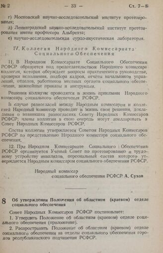 Постановление Совета Народных Комиссаров РСФСР. Об утверждении Положения об областном (краевом) отделе социального обеспечения. 17 ноября 1943 г. № 941