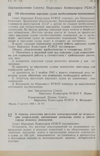 Постановление Совета Народных Комиссаров РСФСР. Об обеспечении народных судов необходимыми помещениями. 8 августа 1943 г. № 711