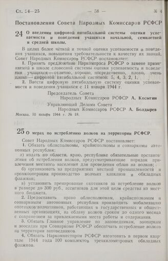 Постановление Совета Народных Комиссаров РСФСР. О введении цифровой пятибалльной системы оценки успеваемости и поведения учащихся начальной, семилетней и средней школы. 10 января 1944 г. № 18