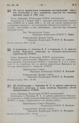Постановление Совета Народных Комиссаров РСФСР. Об освобождении т. Терешина Ф. Т. от работы заместителя Народного комиссара и члена коллегии Наркомата легкой промышленности РСФСР. 21 февраля 1944 г. № 156