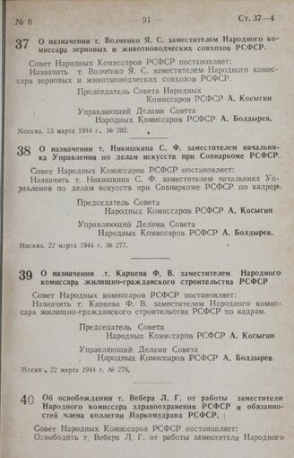 Постановление Совета Народных Комиссаров РСФСР. О назначении т. Карцева Ф. В. заместителем Народного комиссара жилищно-гражданского строительства РСФСР. 22 марта 1944 г. № 278