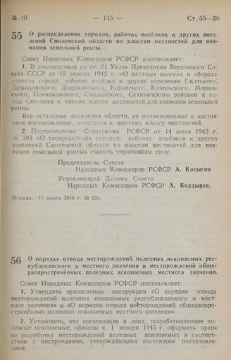 Постановление Совета Народных Комиссаров РСФСР. О распределении городов, рабочих поселков и других поселений Смоленской области по классам местностей для взимания земельной ренты. 11 марта 1944 г. № 194