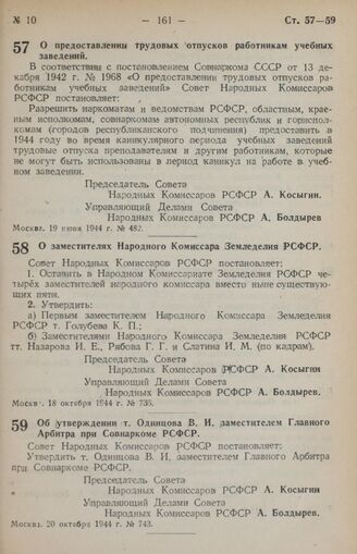 Постановление Совета Народных Комиссаров РСФСР. О предоставлении Трудовых отпусков работникам учебных заведений. 19 июня 1944 г. № 482