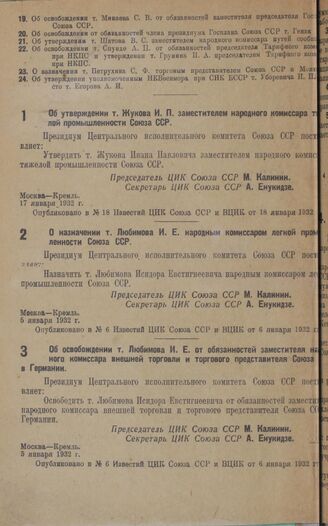 Об освобождении т. Любимова И. Е. от обязанностей заместителя народного комиссара внешней торговли и торгового представителя Союза ССР в Германии. 5 января 1932 г. // Опубликовано в № 6 Известий ЦИК Союза ССР и ВЦИК от 6 января 1932 г.