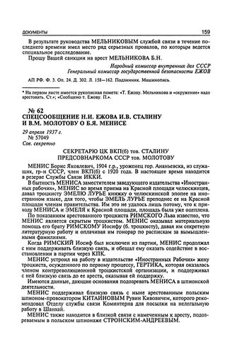 Спецсообщение Н.И. Ежова И.В. Сталину и В.М. Молотову о Б.Я. Менисе. 29 апреля 1937 г. // АП РФ. Ф. 3. Оп. 24. Д. 303. Л. 1-2. Подлинник. Машинопись.