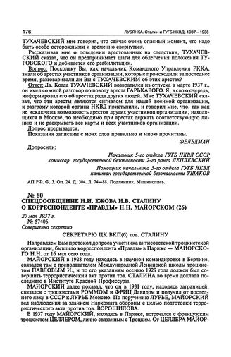 Спецсообщение Н.И. Ежова И.В. Сталину о корреспонденте «Правды» Н.Н. Майорском. 20 мая 1937 г. // АП РФ. Ф. 3. Оп. 24. Д. 304. Л. 107-108. Подлинник. Машинопись.