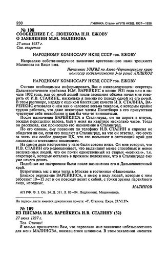 Сообщение Г.С. Люшкова Н.И. Ежову о заявлении М.М. Малинова. 27 июня 1937 г.
