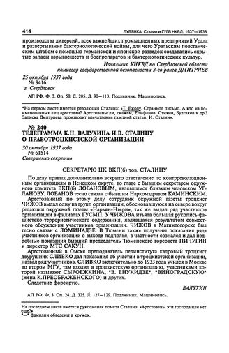 Телеграмма К.Н. Валухина И.В. Сталину о правотроцкистской организации. 30 октября 1937 г.