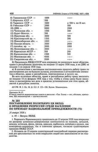 Главная Серия «Россия. XX век. Документы» Лубянка. Сталин и Главное управление госбезопасности НКВД. 1937-1938 Постановление Политбюро ЦК ВКП(б) о продлении репрессий среди насел...