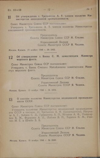 Постановление Совета Министров СССР. Об утверждении т. Третьякова А. Т. членом коллегии Министерства авиационной промышленности. 13 ноября 1946 г. № 2462