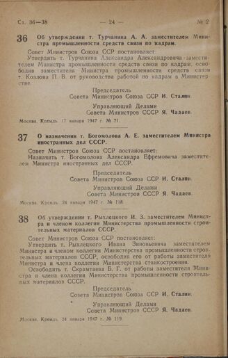 Постановление Совета Министров СССР. Об утверждении т. Турчанина А. А. заместителем Министра промышленности средств связи по кадрам. 17 января 1947 г. № 71