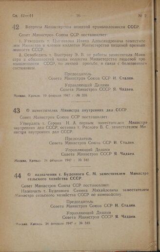 Постановление Совета Министров СССР. О назначении т. Буденного С. М. заместителем Министра сельского хозяйства СССР. 24 февраля 1947 г. № 349