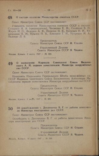Собрание постановлений и распоряжений Совета Министров СССР за 1947 год. № 1-12. — М., б. г.