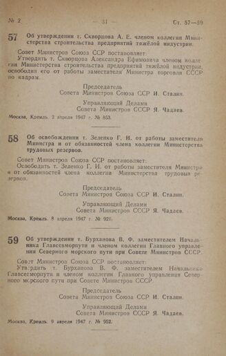Постановление Совета Министров СССР. Об освобождении т. Зеленко Г. И. от работы заместителя Министра и от обязанностей члена коллегии Министерства трудовых резервов. 8 апреля 1947 г. № 921