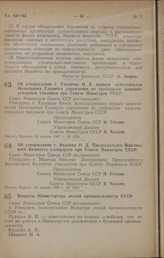 Постановление Совета Министров СССР. Об утверждении т. Ульянова И. А. первым заместителем Начальника Главного управления по снабжению каменноугольным топливом при Совете Министров СССР. 16 апреля 1947 г. № 1053