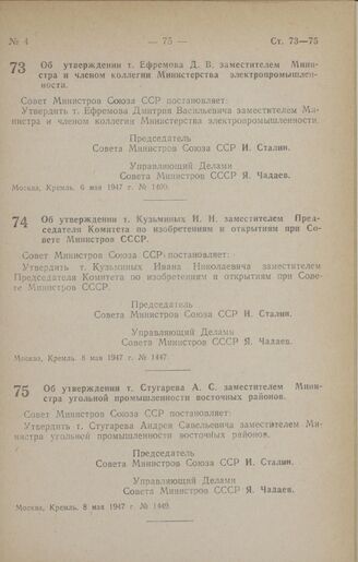 Постановление Совета Министров СССР. Об утверждении т. Стугарева А. С. заместителем Министра угольной промышленности восточных районов. 8 мая 1947 г. № 1450