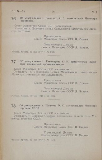 Постановление Совета Министров СССР. Об утверждении т. Шпакова О. С. заместителем Министра торговли СССР. 12 мая 1947 г. № 1514
