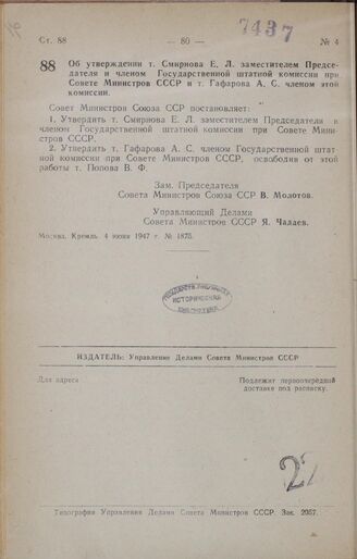 Постановление Совета Министров СССР. Об утверждении т. Смирнова Е. Л. заместителем Председателя и членом Государственной штатной комиссии при Совете Министров СССР и т. Гафарова А. С. членом этой комиссии. 4 июня 1947 г. № 1875