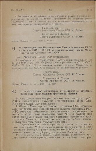 Постановление Совета Министров СССР. О распространении Постановления Совета Министров СССР от 10 мая 1947 г. № 1461 на военные конные заводы Министерства вооруженных сил СССР. 14 июля 1947 г. № 2496