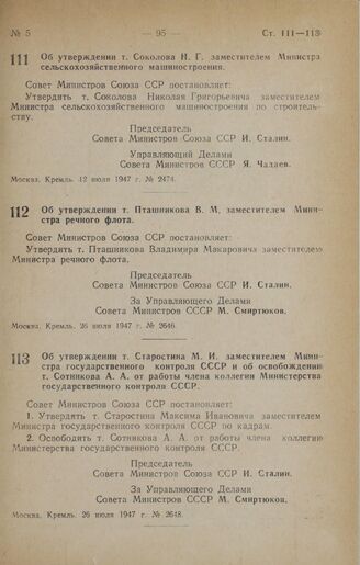 Постановление Совета Министров СССР. Об утверждении т. Старостина М. И. заместителем Министра государственного контроля СССР и об освобождении т. Сотникова А. А. от работы члена коллегии Министерства государственного контроля СССР. 26 июля 1947 г. № 2648
