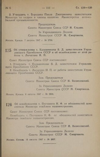 Постановление Совета Министров СССР. Об утверждении т. Калашникова В. Д. заместителем Управляющего Промбанком СССР и об освобождении от этой работы т. Лычагина И. П. 8 августа 1947 г. № 2806