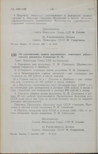 Постановление Совета Министров СССР. Об увековечении памяти крупнейшего советского ученого-геолога академика Степанова П. И. 2 сентября 1947 г. № 3114