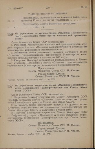 Постановление Совета Министров СССР. Об учреждении нагрудного значка «Отличник социалистического соревнования Министерства медицинской промышленности». 24 сентября 1947 г. № 3336