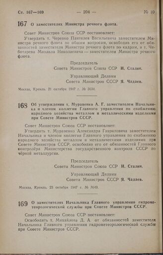 Постановление Совета Министров СССР. О заместителях Начальника Главного управления гидрометеорологической службы при Совете Министров СССР. 25 октября 1947 г. № 3674
