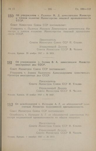 Постановление Совета Министров СССР. Об утверждении т. Зорина В. А. заместителем Министра иностранных дел СССР. 25 ноября 1947 г. № 3857
