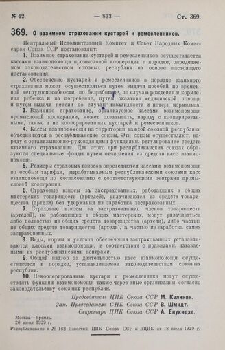 Постановление Центрального Исполнительного Комитета и Совета Народных Комиссаров. О взаимном страховании кустарей и ремесленников. 26 июня 1929 г. // Распубликовано в № 162 Известий ЦИК Союза ССР и ВЦИК от 18 июля 1929 г.