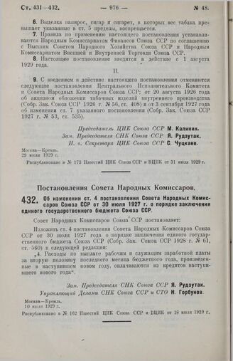 Постановление Совета Народных Комиссаров. Об изменении ст. 4 постановления Совета Народных Комиссаров Союза ССР от 30 июля 1927 г. о порядке заключения единого государственного бюджета Союза ССР. 10 июля 1929 г.