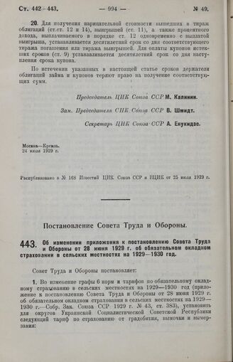 Постановление Совета Труда и Обороны. Об изменении приложения к постановлению Совета Труда и Обороны от 28 июня 1929 г. об обязательном окладном страховании в сельских местностях на 1929-1930 год. 6 августа 1929 г.