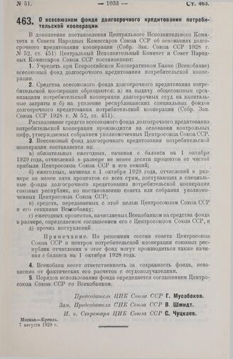 Постановление Центрального Исполнительного Комитета и Совета Народных Комиссаров. О всесоюзном фонде долгосрочного кредитования потребительской кооперации. 7 августа 1929 г.