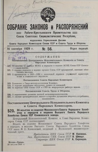 Постановление Центрального Исполнительного Комитета и Совета Народных Комиссаров. Об изъятии из ведения Московского Совета Народного Хозяйства и передача в ведение Высшего Совета Народного Хозяйства Союза ССР Климовского завода. 28 августа 1929 г.