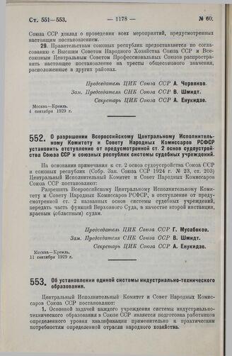 Постановление Центрального Исполнительного Комитета и Совета Народных Комиссаров. О разрешении Всероссийскому Центральному Исполнительному Комитету и Совету Народных Комиссаров РСФСР установить отступление от предусмотренной ст. 2 основ судоустройства Союза ССР и союзных республик системы судебных учреждений. 11 сентября 1929 г.