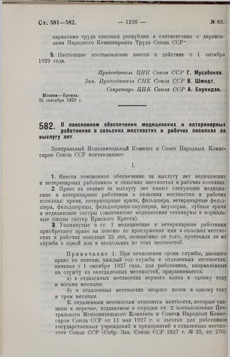 Постановление Центрального Исполнительного Комитета и Совета Народных Комиссаров. О пенсионном обеспечении медицинских и ветеринарных работников в сельских местностях и рабочих поселках за выслугу лет. 25 сентября 1929 г.