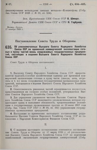 Постановление Совета Труда и Обороны. Об уполномоченных Высшего Совета Народного Хозяйства Союза ССР по временной коммерческой эксплоатации готовых к пуску частей вновь сооружаемых государственных предприятий, состоящих в ведении Высшего Совета Народного Хозяйства Союза ССР. 13 октября 1929 г.